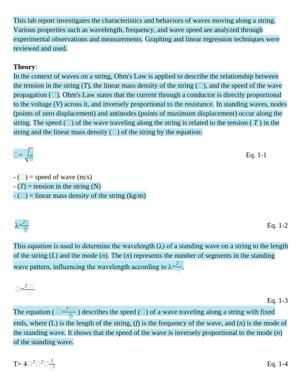 Speaking of going off the rails, I am attaching an example that a colleague shared. The blue highlights denote AI-generated text (More than 80% of this report was AI-generated). Note the first sentence of the "Theory" section where Ohm's Law is applied to a vibrating string. Wow! This student did not learn enough physics to recognize that Ohm's law relates voltage, current, and resistance in a conductor, and has nothing to do with tension, mass, and wave propagation in a string!